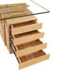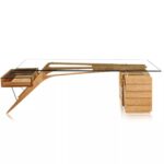 A study of the architectural elements comprising the structure of the Desk. It brings full appreciation for the modernist masterpiece. A chair would slide beneath two boomerang Solid Ash support beams. At the point where vertical transforms to horizontal, rounded oblong shapes have been cut out of the beams creating a transparent airy illusion. Resting on raised stainless steel support buttons, A 15mm thick tempered glass plate provides an elegant writing surface for Protractor. Stainless steel bolt sleeves float the wooden beams off the surface of the slatted cube of 5 drawers. On the opposite side, total transparency is achieved with an open-faced single pull-out drawer covered by a 15mm glass panel. Two steel rods extend from the boomerang beams, supporting the outer edge of the transparent drawer. A design marvel exceptionally reproduced and coated with a brilliant lustrous finish.