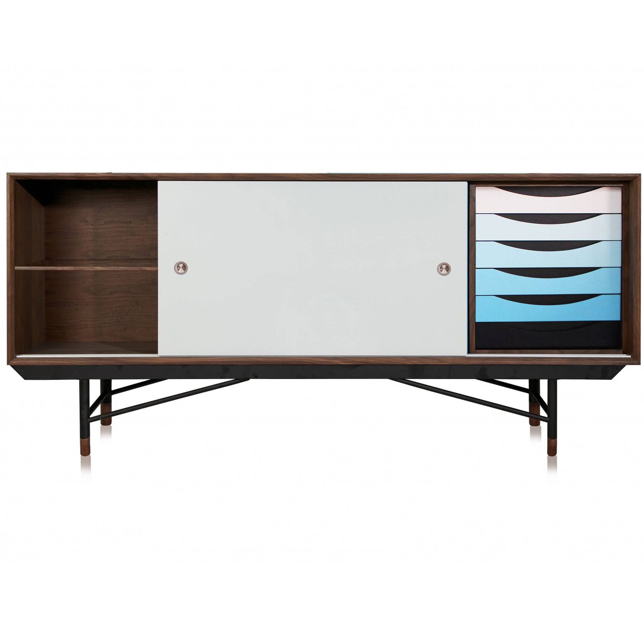 At the time of its origin, this timeless design was part of a theme of cubist wood sideboards that hovered over thin shapely steel frames with actual wood feet. Introduce a sense of whimsical modernism to any theme from mid century to loft modern.