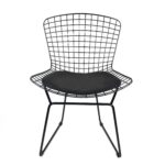 This classic mid-20th century modern replica chair is a brilliant design. the stool is exceptionally strong and surprisingly comfortable with its unique bent and welded steel rod construction. Black Wire Side Chair makes a clean, simple addition to a dining room or outside patio area. Constructed from Black-coated steel, this chair features a black seat. Slip-resistant rubber pads on the bottom prevent scratching and sliding on surfaces.