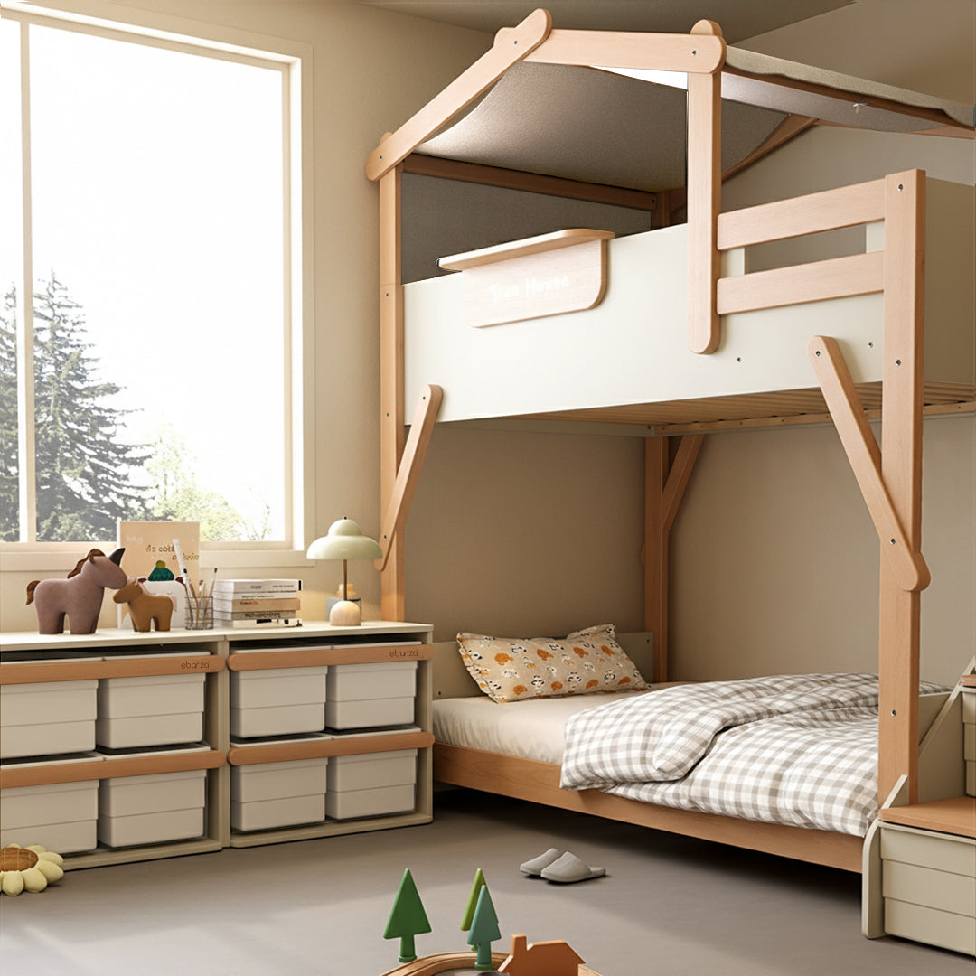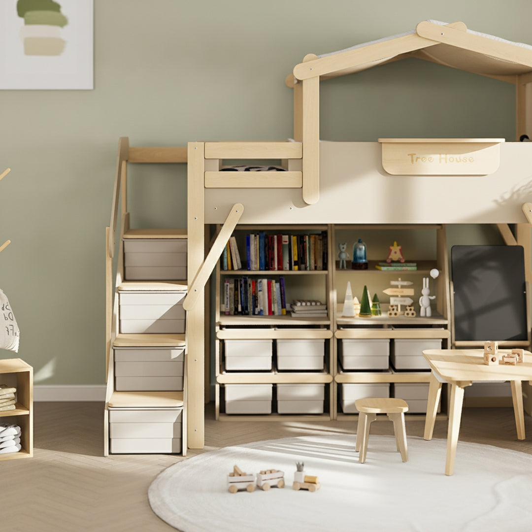 The King Double Kids Bed –  Treehouse Collection Transform your child’s bedroom into an imaginative sanctuary with this premium Boori Treehouse King Single Loft Bed system. This sophisticated modular collection combines functional design with playful architecture, featuring a spacious loft sleeping platform (203x107x18cm mattress) elevated above dedicated storage and activity zones. The comprehensive set includes the four-section loft bed frame, integrated treehouse roof, conversion kit for extended configurations, dual-section storage staircase with built-in compartments, and textile tent canopy for enhanced ambiance. Each component ships separately for convenient assembly and flexible installation. Crafted with meticulous attention to detail, this system grows with your child—adapting from a cozy retreat into a multi-functional bedroom centerpiece. Perfect for maximizing space while nurturing creativity and independence in contemporary homes.