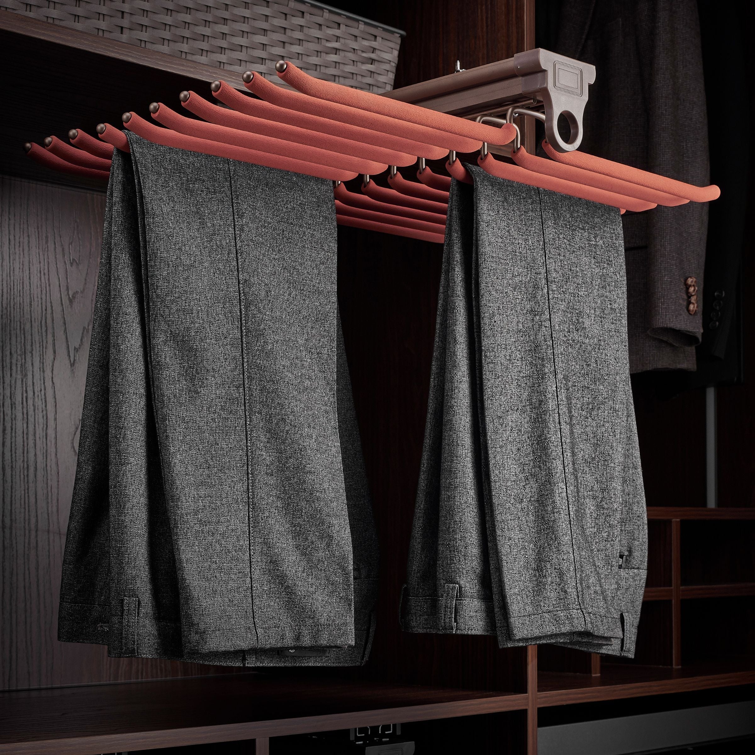 Our TROUSERS RACK(SOFT CLOSING) is here to help you make closet organization a breeze! It features a soft-closing mechanism, perfect for hanging trousers with ease and avoiding noisy slams. This clever rack will have your room looking shipshape in no time!